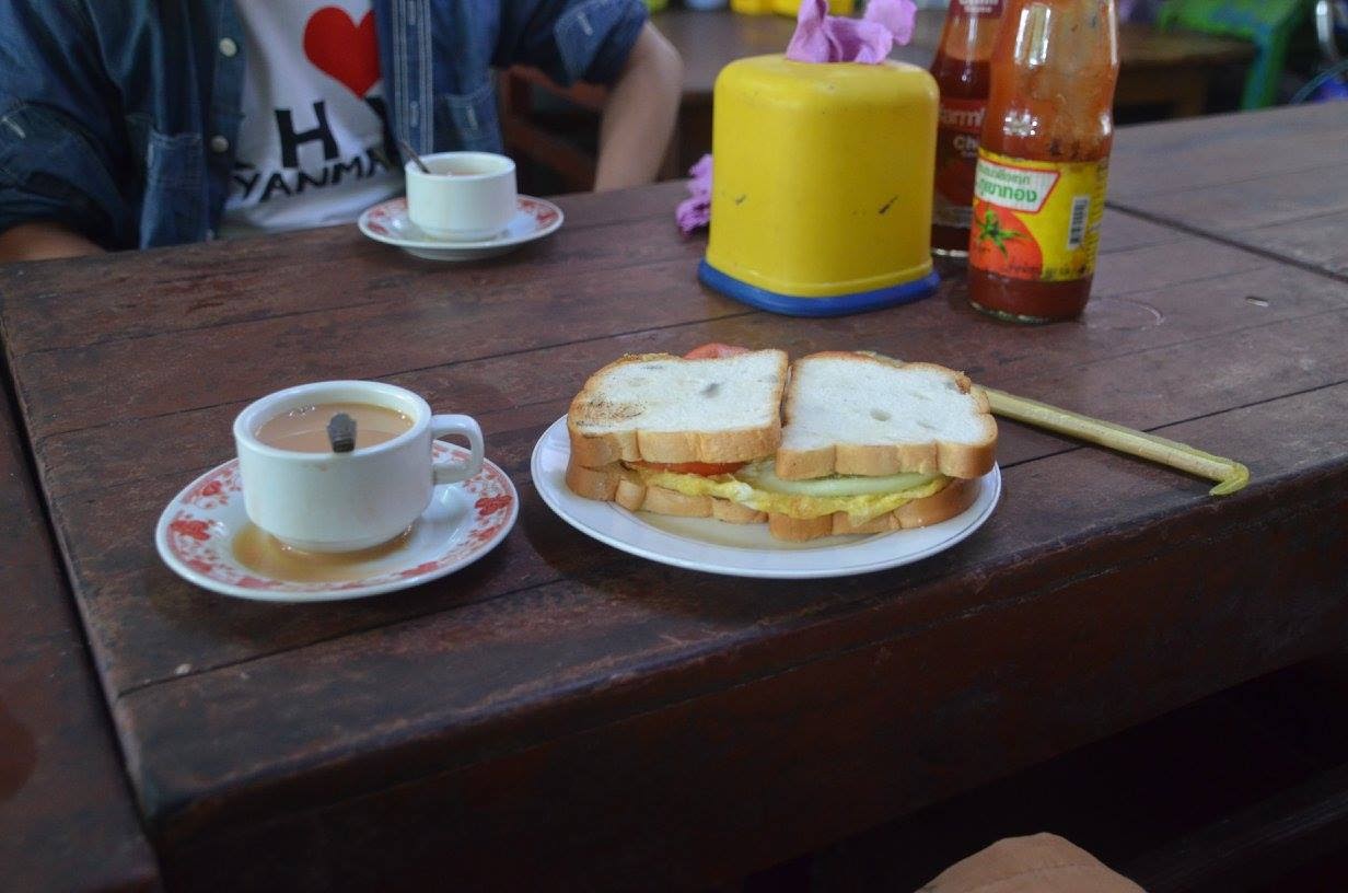 最後在一家印度人開的早餐店坐了下來,老闆一口流利的英文正是吸引我們入坐的關鍵,這裡的人早餐幾乎都沒有菜單,英文溝通就變成了對外地人很重要的事情,緬甸的西式早餐很特別,三明治只有土司夾蛋在配上奶茶,大部分店裡的奶茶都是即溶粉泡成的,就算是坐在店裡也很少有用茶葉泡出來的奶茶,當地人並不覺得沖泡式的飲料不適合放在店裡販售,這也成為了特殊的景象之一.